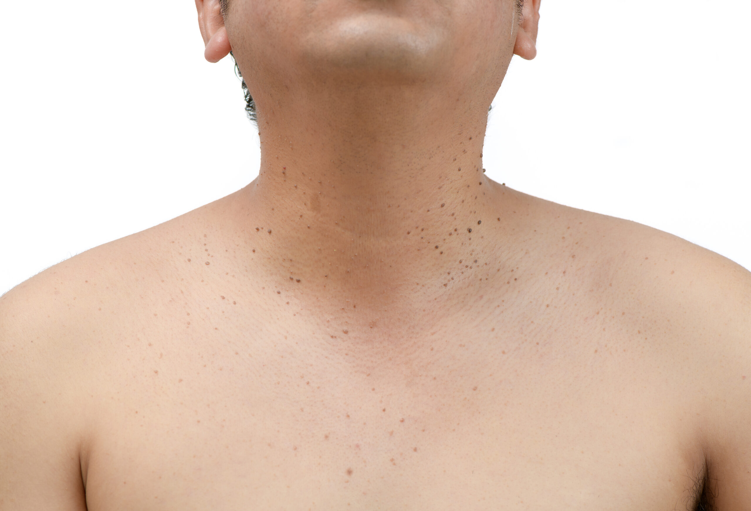 Closed up the skin tags or Seborrheic Keratosis on neck man isolated on white background.Health care concept